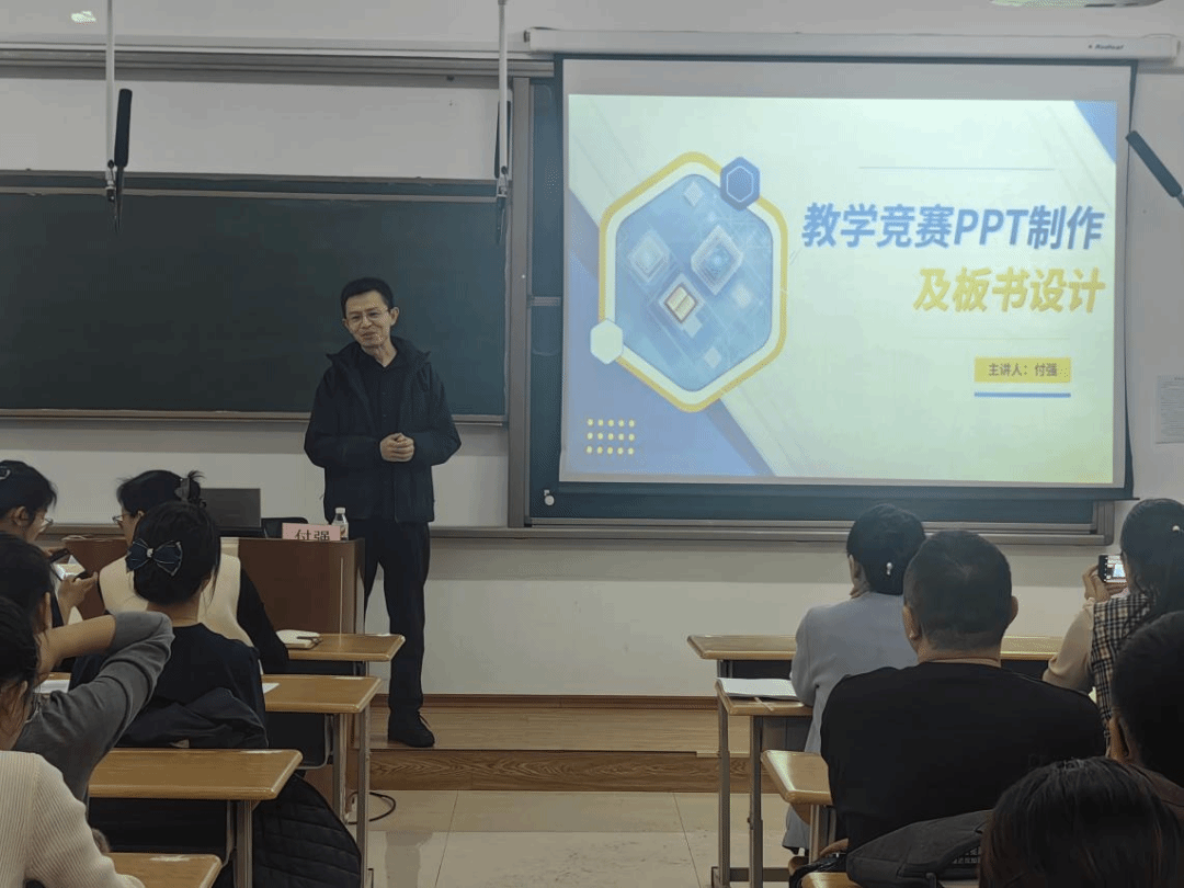 付强围绕“教学竞赛PPT制作及板书设计”进行讲解。在PPT制作上,他强调要凝练思维,做到图文并茂,摒弃繁杂要素,文字简洁且突出重点,以增强可读性与吸引力;在板书设计上,他详细介绍了提纲式、逻辑推导式、对比式、图文结合式等多种方法,指出板书设计要逻辑清晰、条理分明,便于学生理解掌握知识。